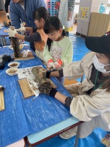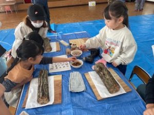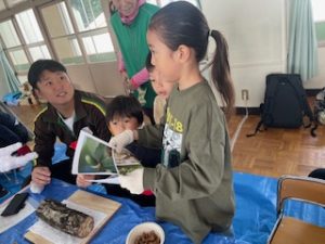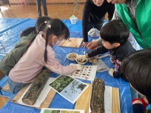 山岳隊の方がどんぐりについて、いろいろなお話を聞かせてくれたり、実際にいろいろな種類のどんぐりを見たり触ったりしました。