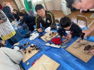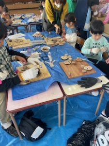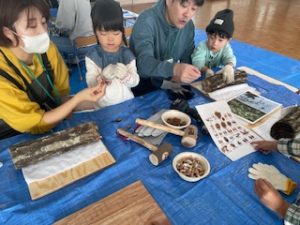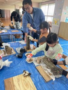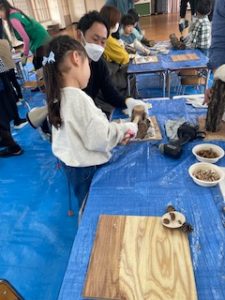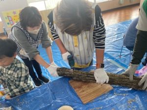 今年度は初めての試みで、園内で「しいたけの原木作りとペンダント作り」をしました。