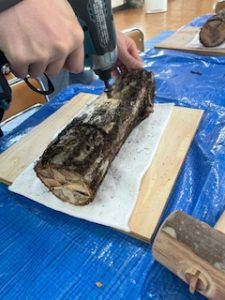 穴を開けた所にしいたけ菌を打ち付けます。